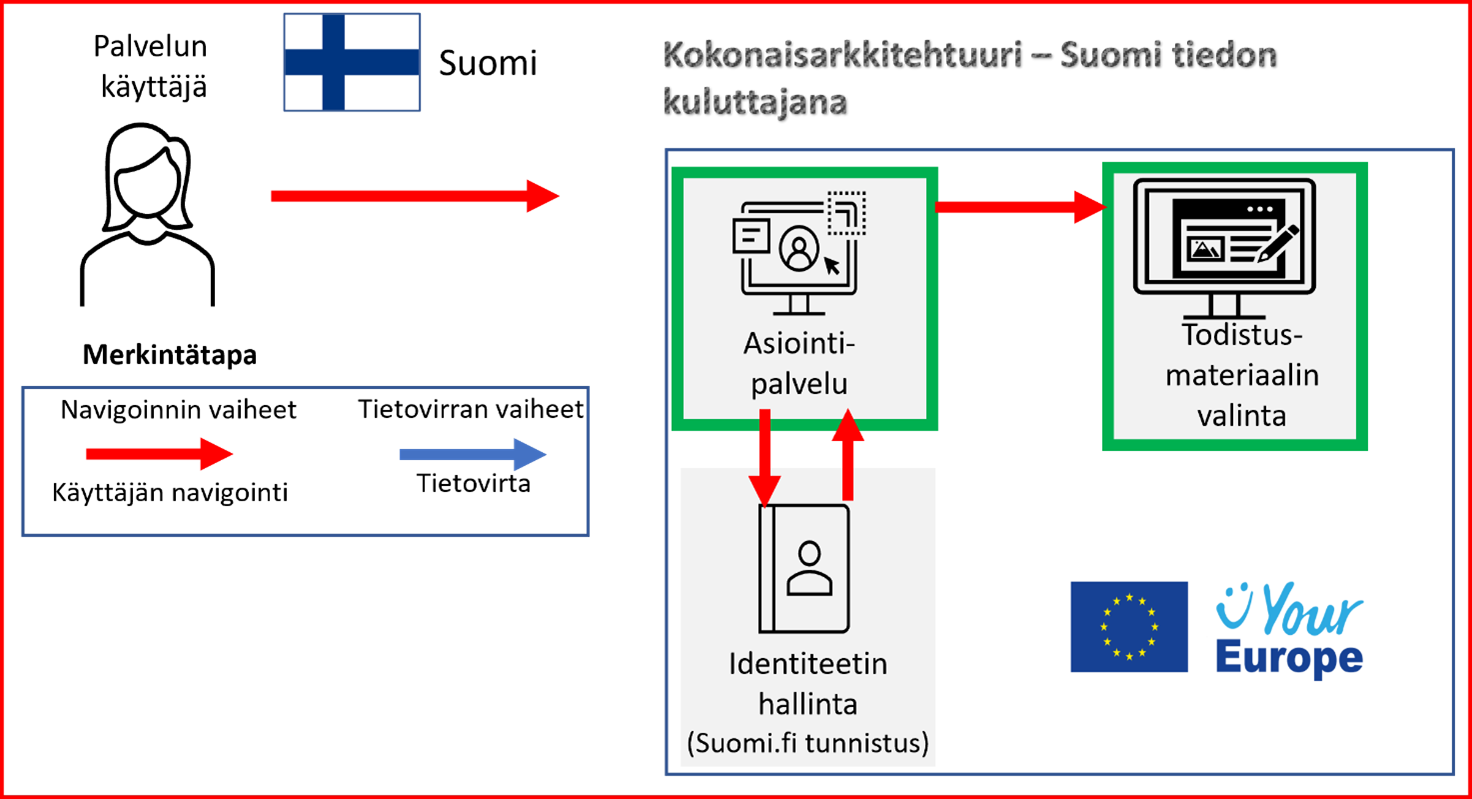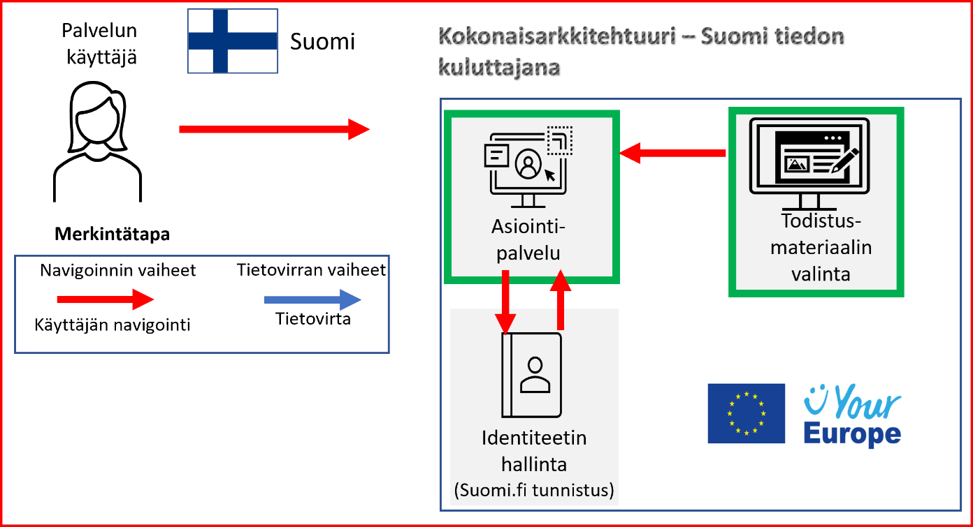 Tietojen pohjalta KEHA-keskus luo asiointipalvelulle linkin, joka koostuu Tietojen haku Suomi -palvelun osoitteesta ja palvelun IntegraatioID:stä. Linkin IntegraatioID:n avulla Tietojen haku Suomi -palvelu pystyy generoimaan tarvittavat tiedot tietojen hakuun toisesta EU-jäsenmaasta.